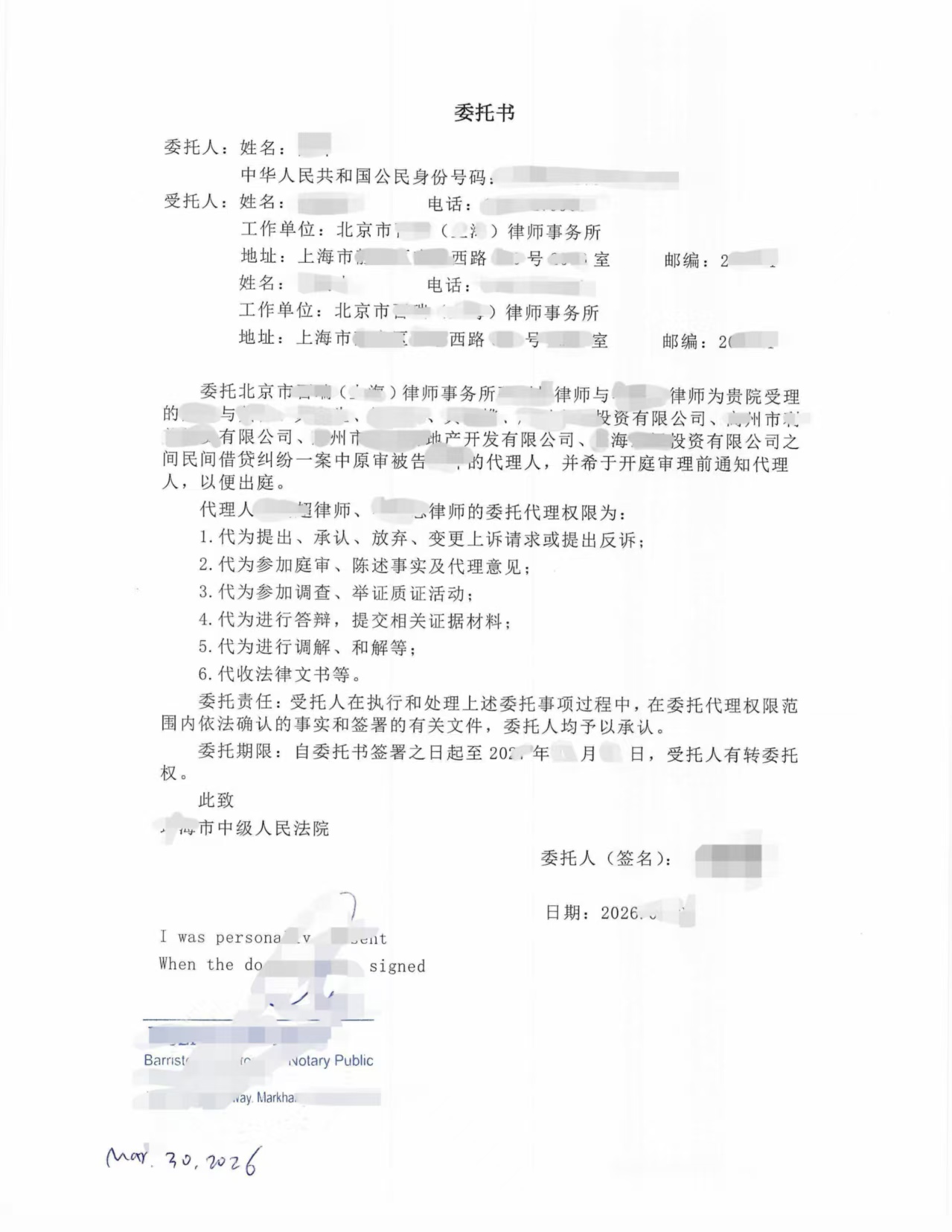 当事人目前人在加拿大,通过我们远程指导签署了一份用于国内民间借贷诉讼的授权委托书,委托国内律师代理出庭、举证、调解等全部诉讼事务。文件在加拿大完成签署后,由本地公证员见证签字,再办理安省海牙认证。