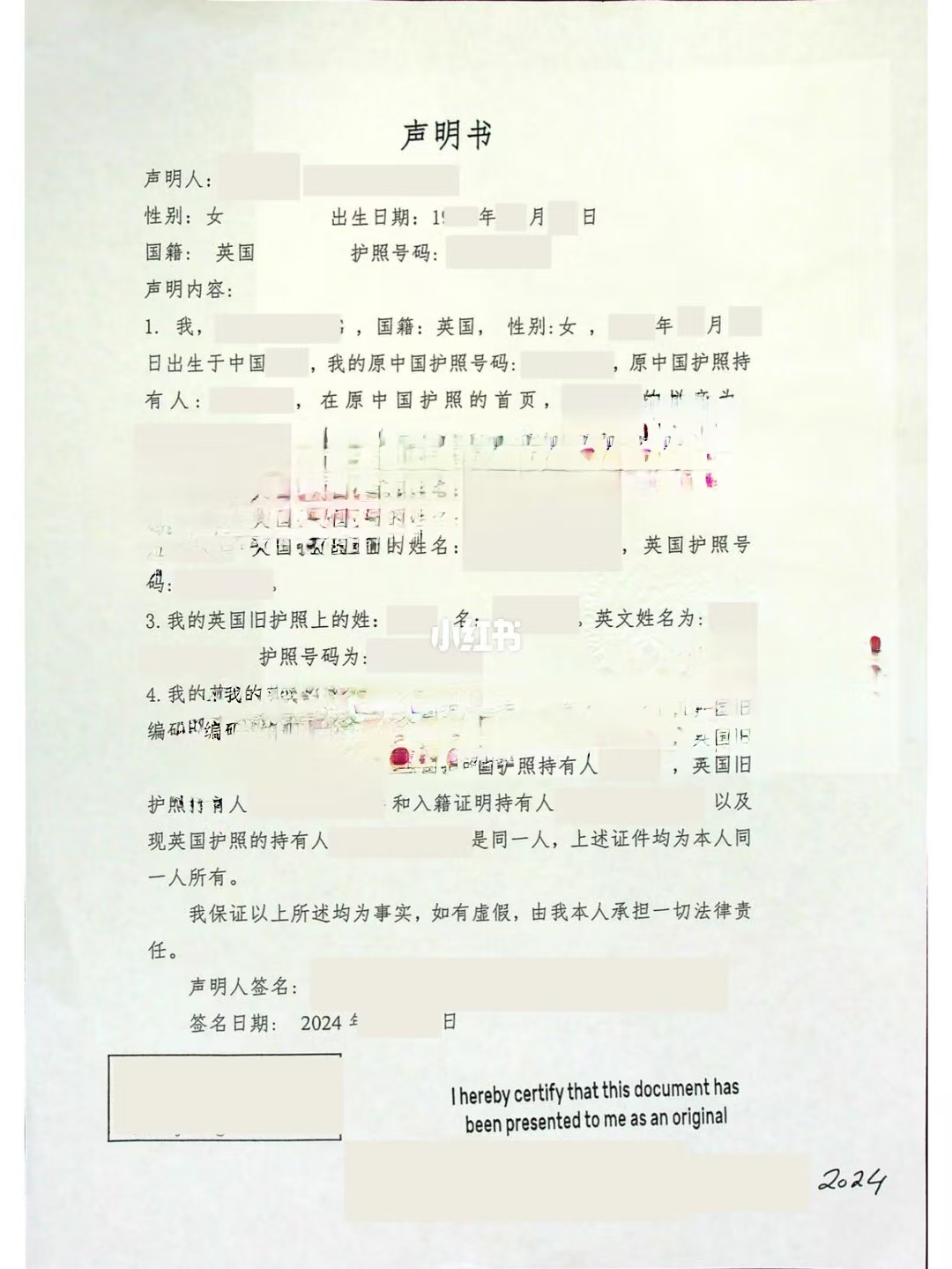 主要用于英籍华人回国办理房产过户、银行账户解冻、遗产继承、婚姻登记、入学落户等事务。证明英国新旧护照、原中国身份证属同一主体,避免因证件信息差异导致业务受阻,是国内官方机构认可的法定身份凭证。