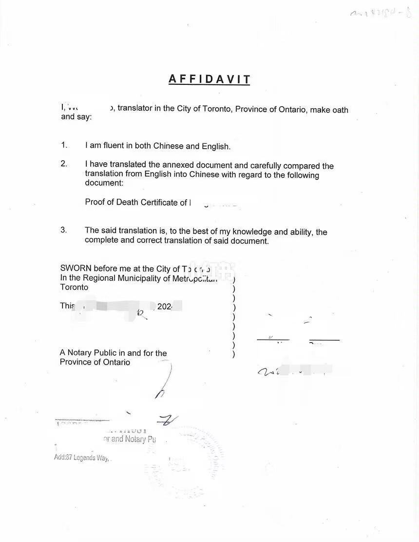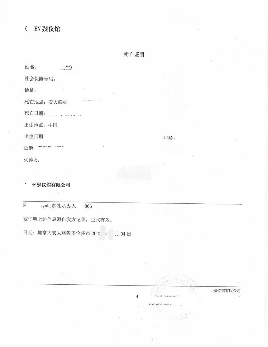 近期、一位移民加拿大华人的亲属在安省离世,需办理加拿大死亡证明海牙认证、回国处理遗产继承、户口注销、银行销户等后事,首先办妥安省死亡证明英译中翻译 + 海牙认证,文件方可在中国直接生效。