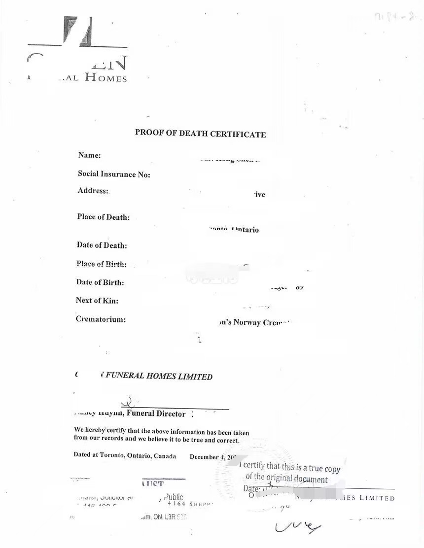 安省官方死亡证明属政府文件,无需额外律师公证,