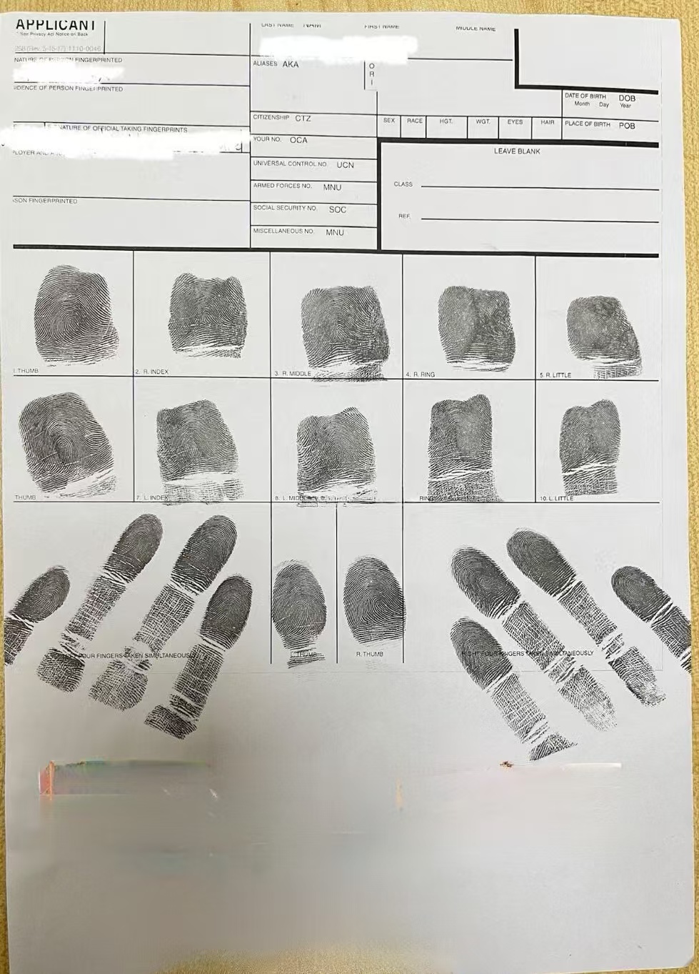 FD-258 标准指纹卡(官网下载)。