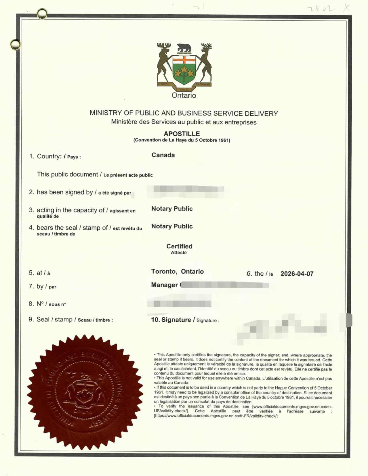 海牙认证由安省政府签发,明确认证了公证人的签名及身份,并标注签发地为Toronto, Ontario,签发日期为2026年4月7日