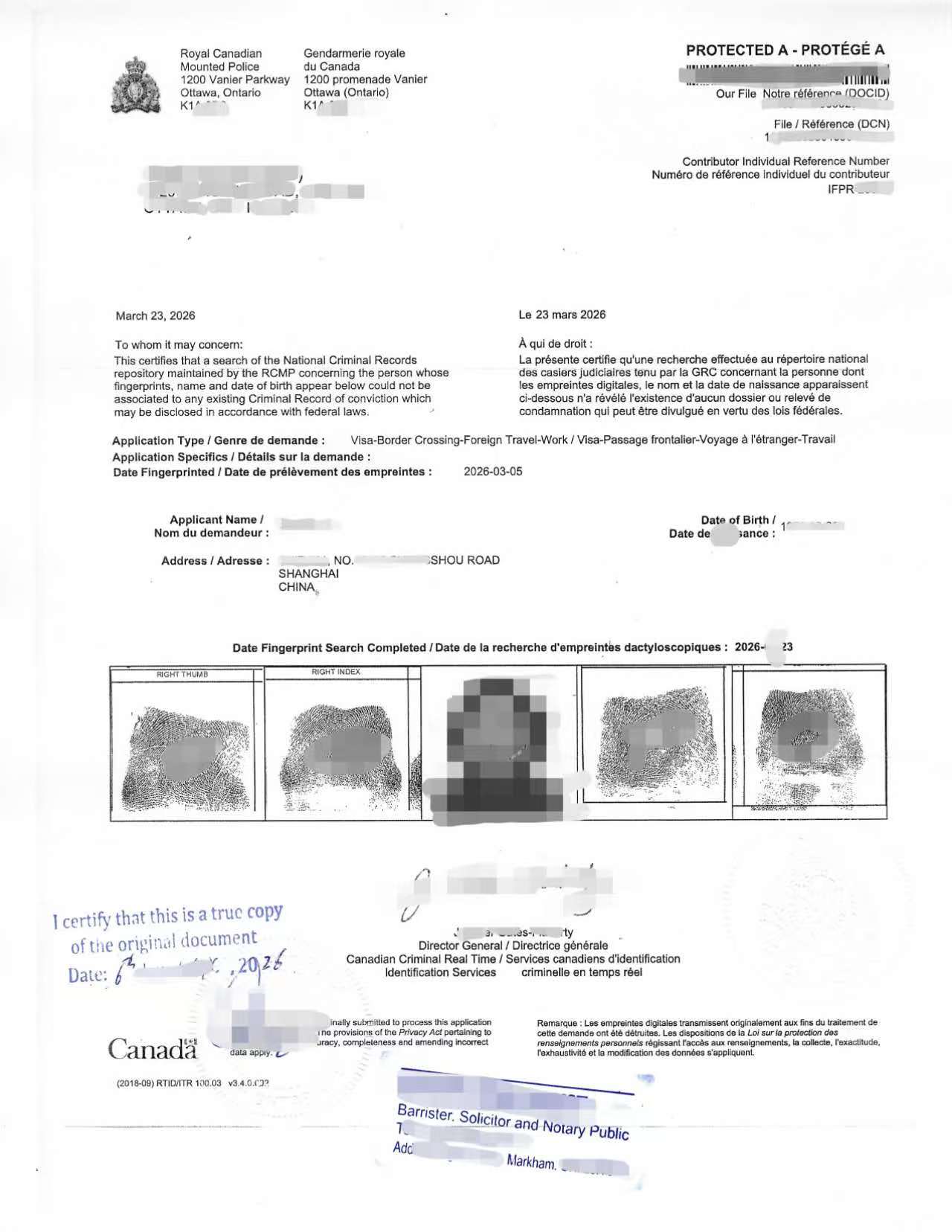 文件链条完整(指纹→RCMP证明→公证→海牙认证);