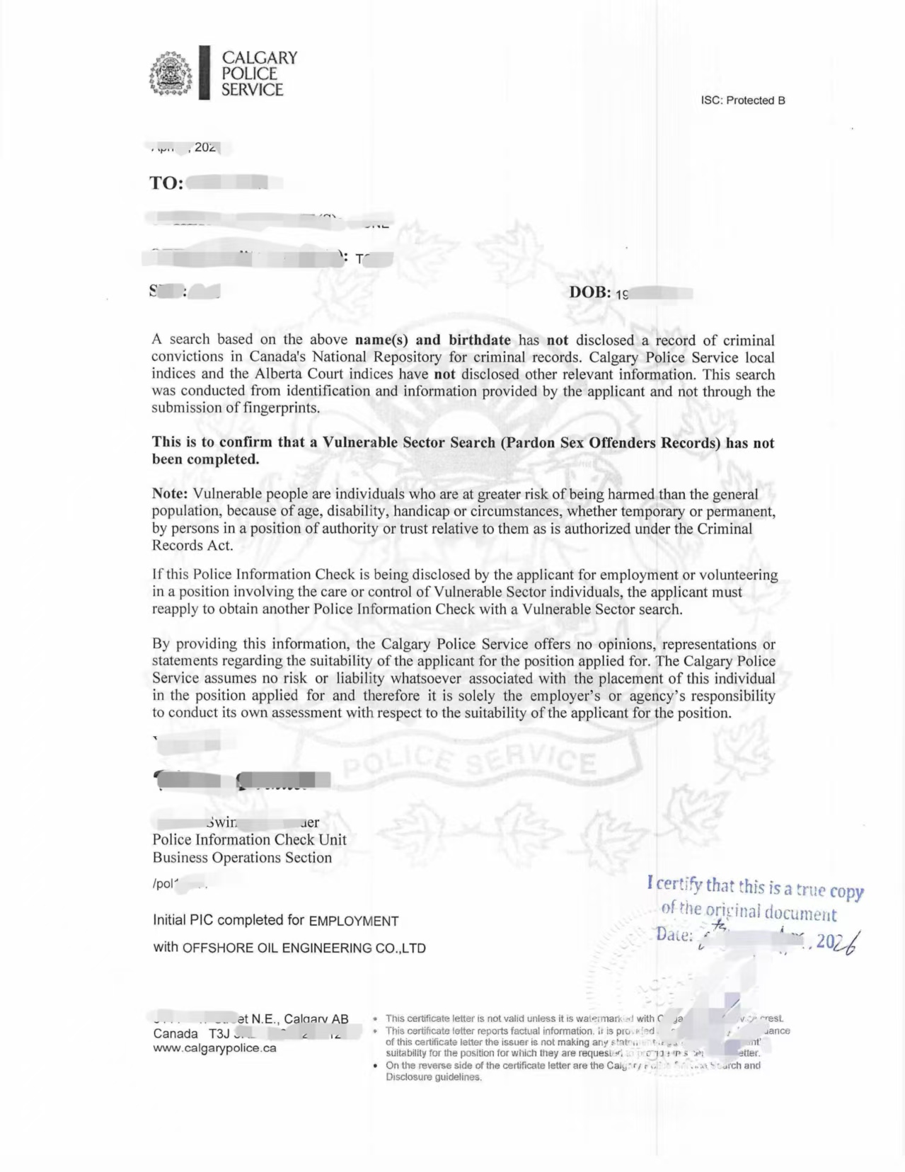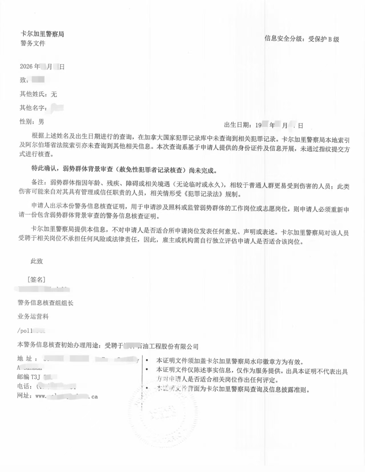 当事人并未在加拿大本地申请带指纹的皇家骑警证明,而是选择办理由卡尔加里警察局出具的不带指纹无犯罪记录证明(Police Information Check)。