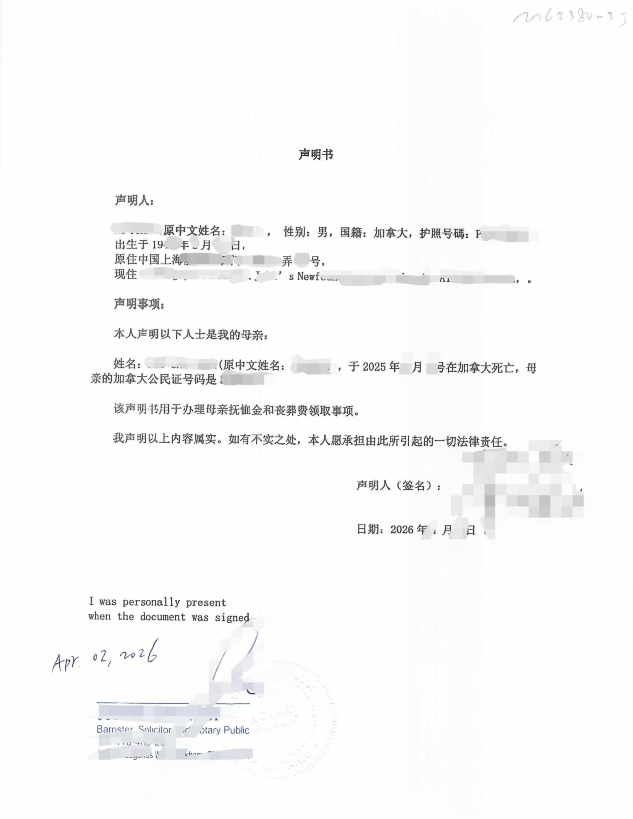 20262380海牙认证样本 母子关系声明书 素材 pdf