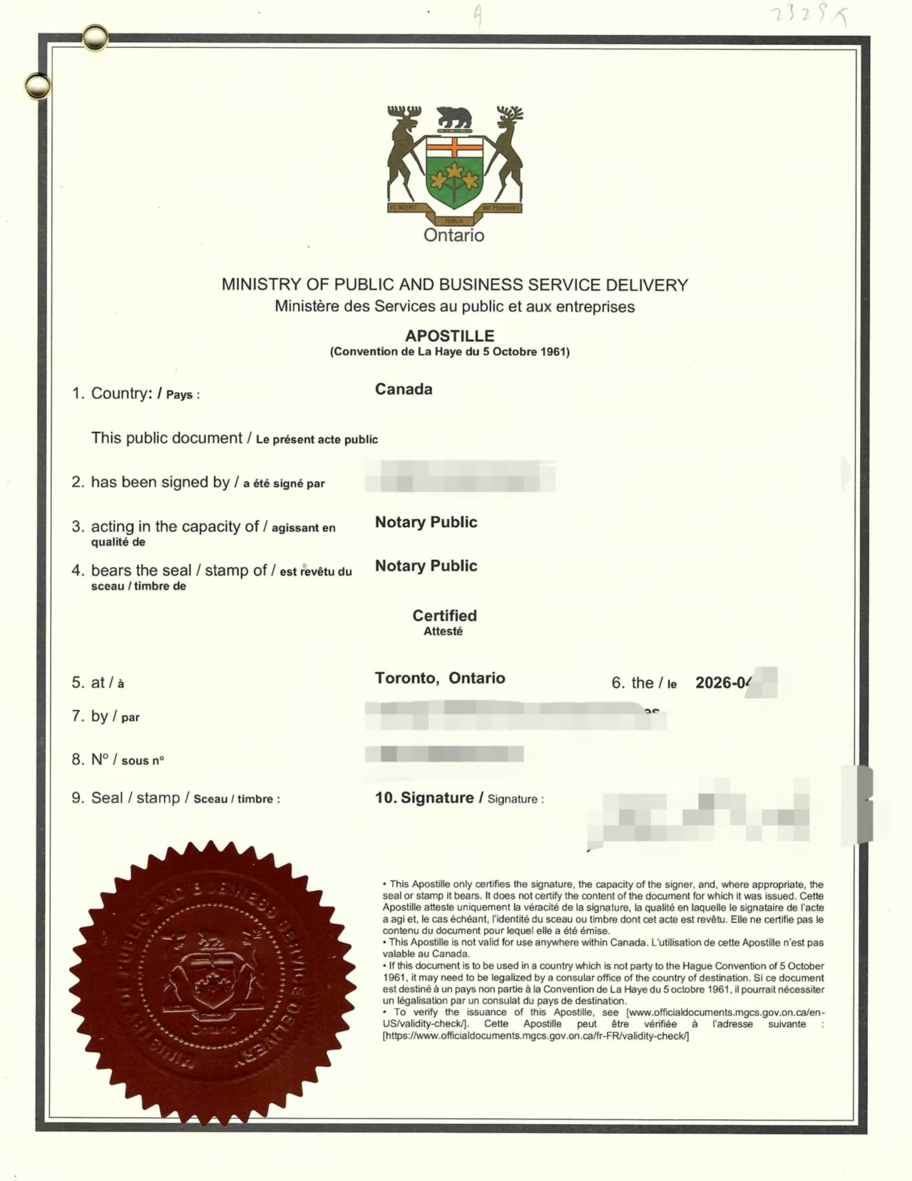 文件完成公证后,直接送安省政府办理附加证明书(Apostille)