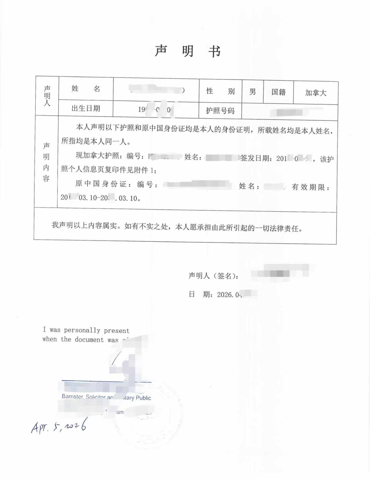 这是一单典型的“中加身份衔接”业务,当事人早年在国内使用四川成都身份证,后来入籍加拿大,持有安省签发的加拿大护照。由于姓名拼音与中文存在差异,在国内办理事务时被要求提供“同一人证明”。