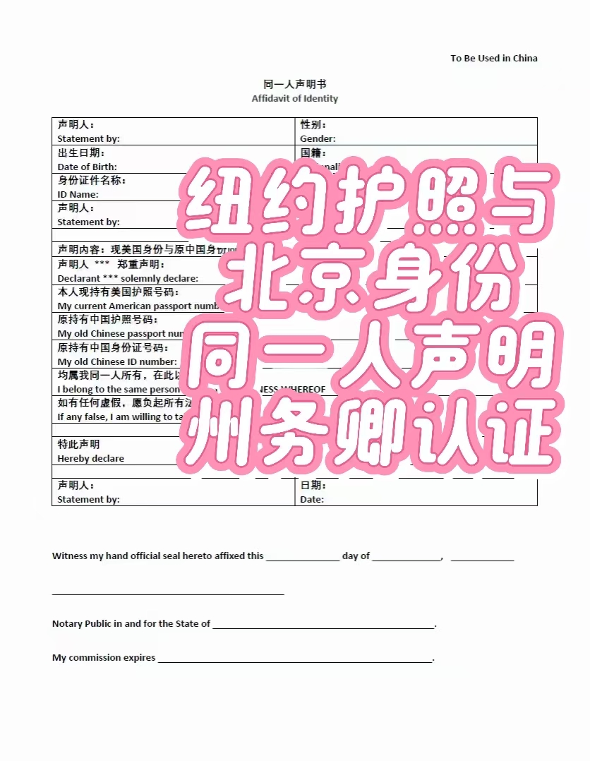 多年前、移民美国的华人持纽约护照、原北京身份证、近期准备回国出售北京房产,但核心前提是必须证明两种身份为同一人,需办理纽约护照与北京身份证、《同一人声明书》及纽约州务卿海牙认证。