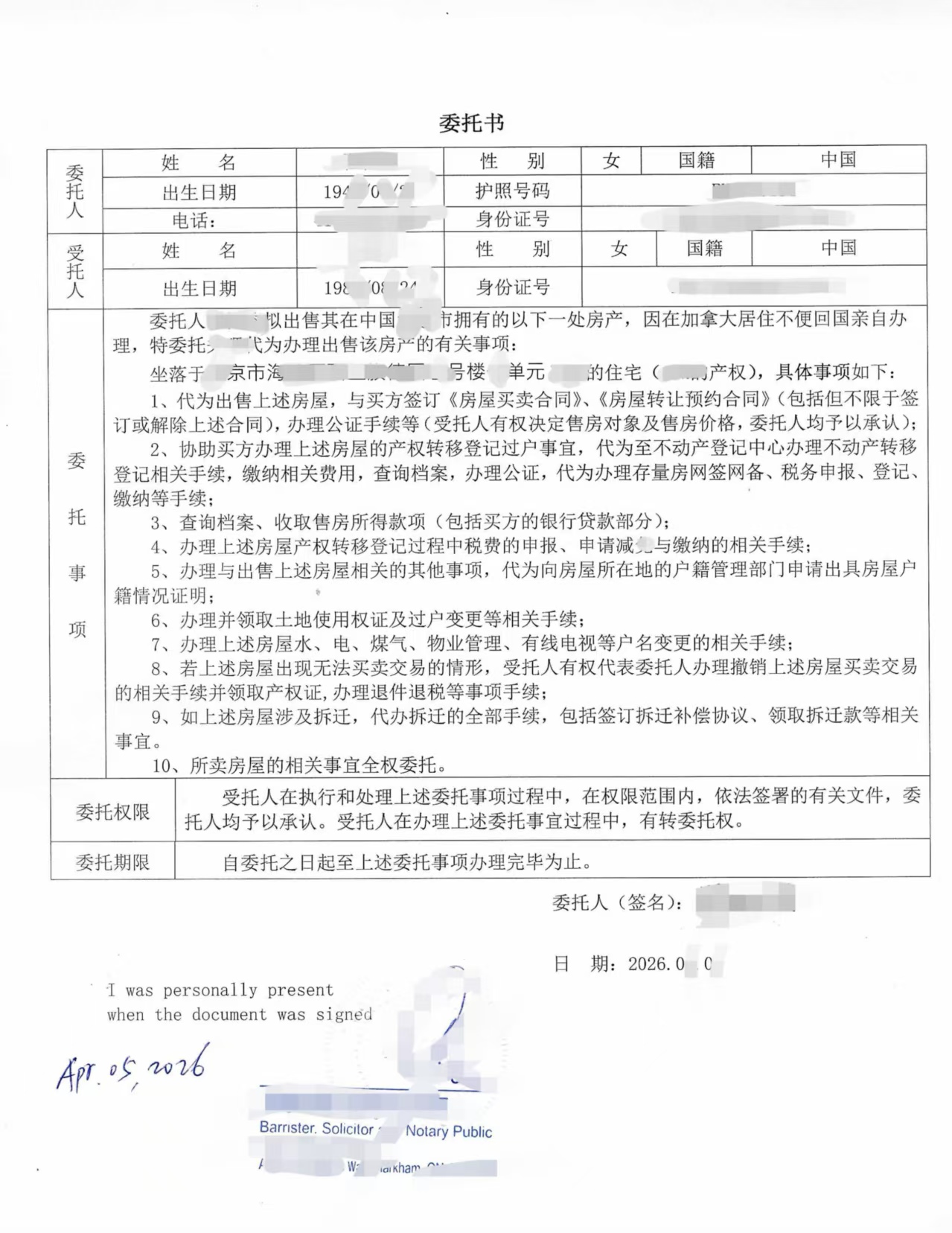 客户是一名中国籍华人在加拿大万锦有自己经营的公司、因资金紧缺急需周转,委托通过授权国内亲友出售南京房产,是最高效的筹资方案。