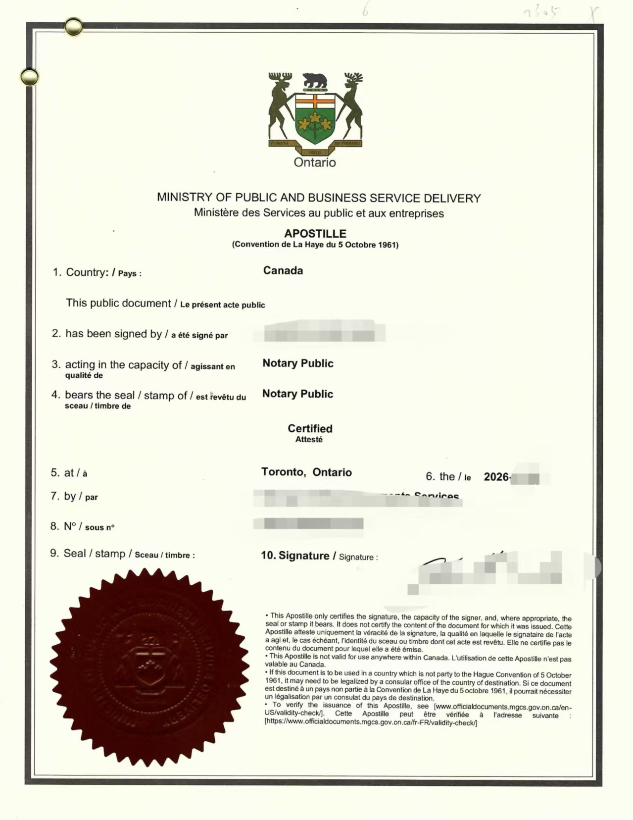 ·公证完成后,您无需再跑多伦多中国签证中心,而是直接将公证文件递交至安省政府服务厅。政府核实公证员签字后,会在文件上附加一页“海牙认证附加证明书(Apostille)” 。