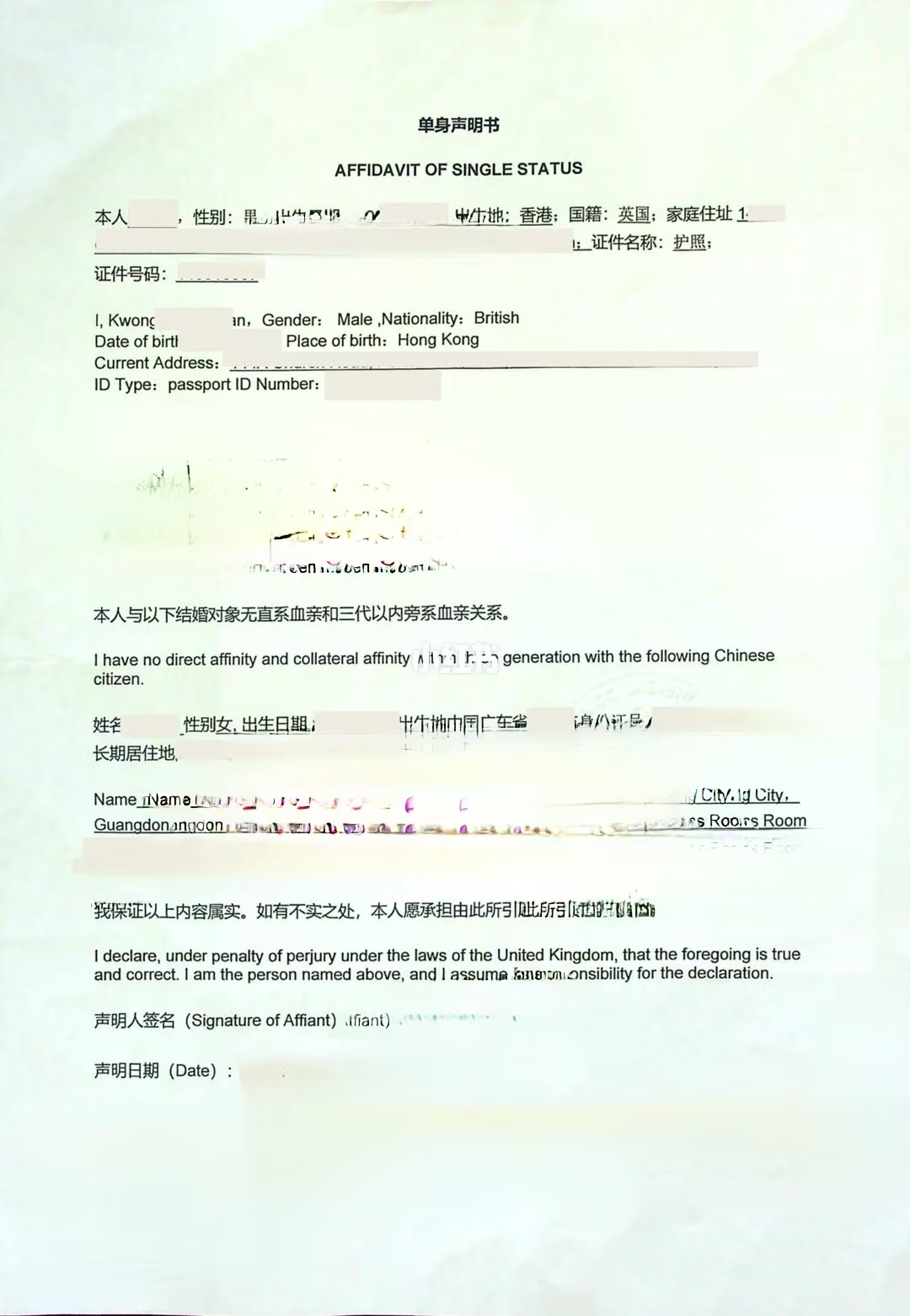 1·是孙先生签署的单身证明声明书,需注明个人姓名、护照号、婚姻状况等核心信息并亲笔签名;