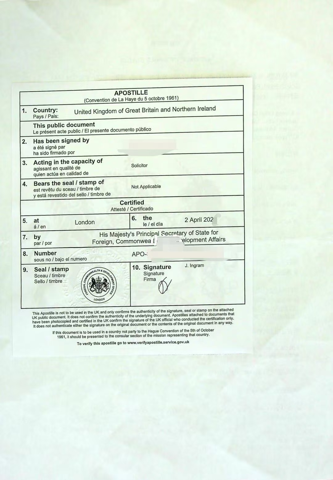 第二步,英国外交部海牙认证,将公证后的文件提交至英国外交部,加盖Apostille认证标识,标准办理需2-3个工作日;