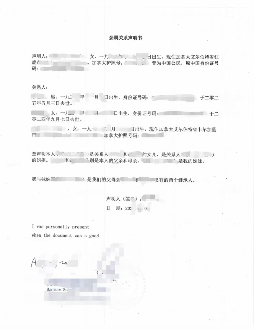 卡尔加里亲属关系声明书加拿大海牙认证案例