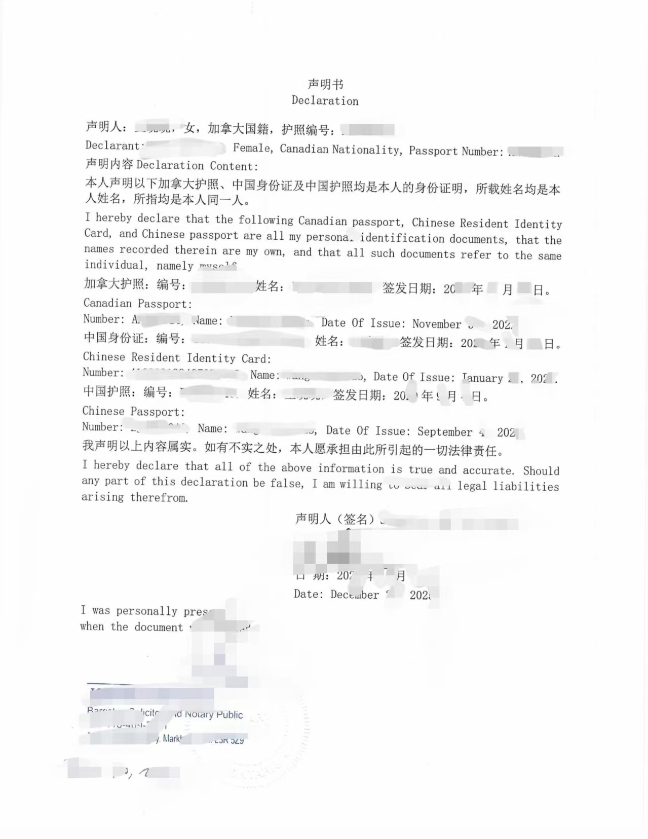 乔女士早年定居成都,后移居加拿大悉尼,近期办理成都房产过户时,因身份信息变更,需提交加拿大悉尼护照与中国护照、身份证同一人声明书海牙认证,方可顺利办结手续。